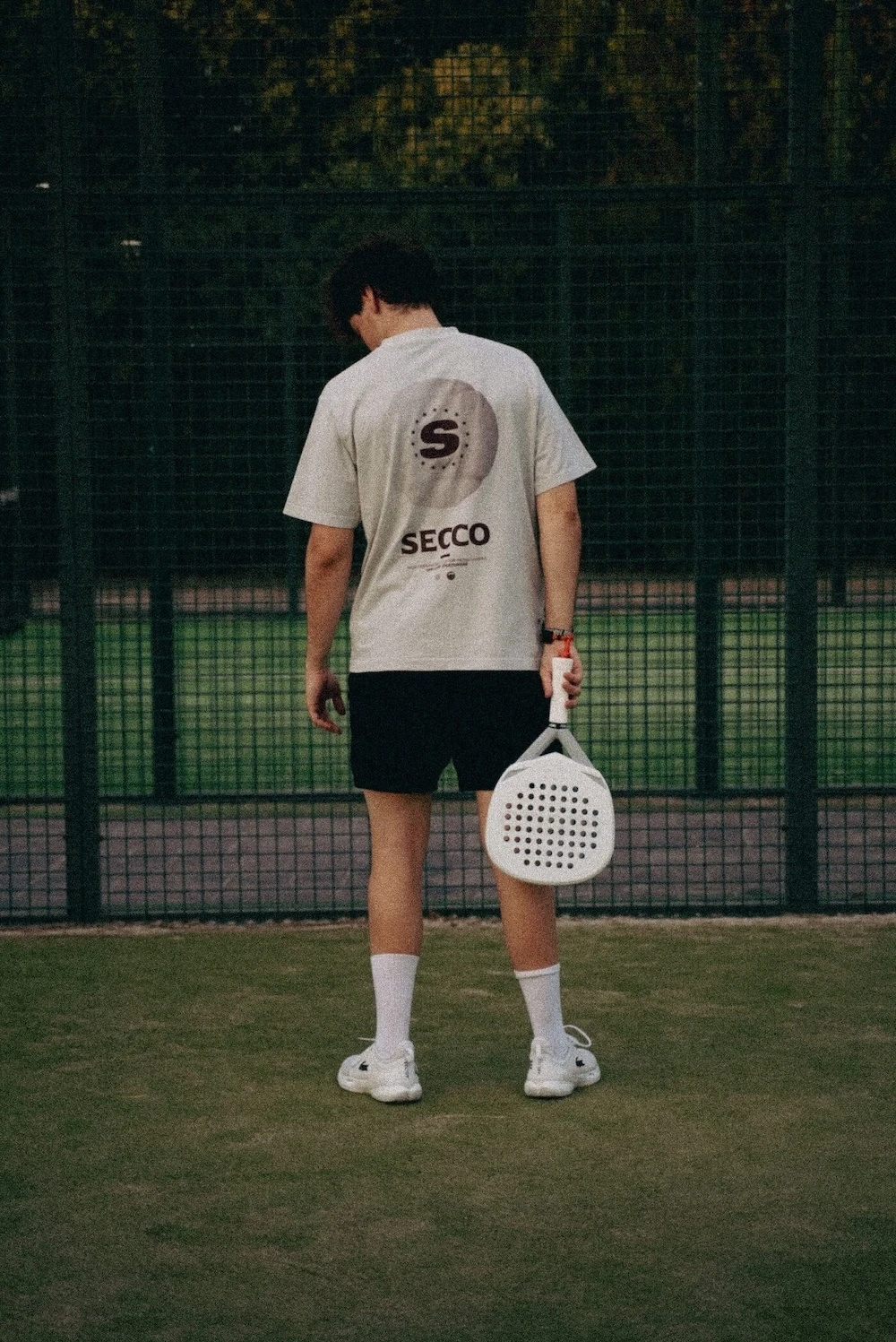 Detalle Secco en color crema en el pecho y diseño gráfico en la espalda.